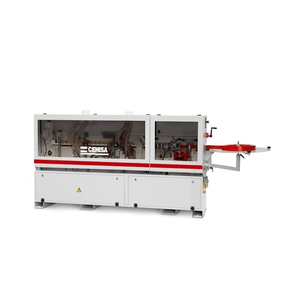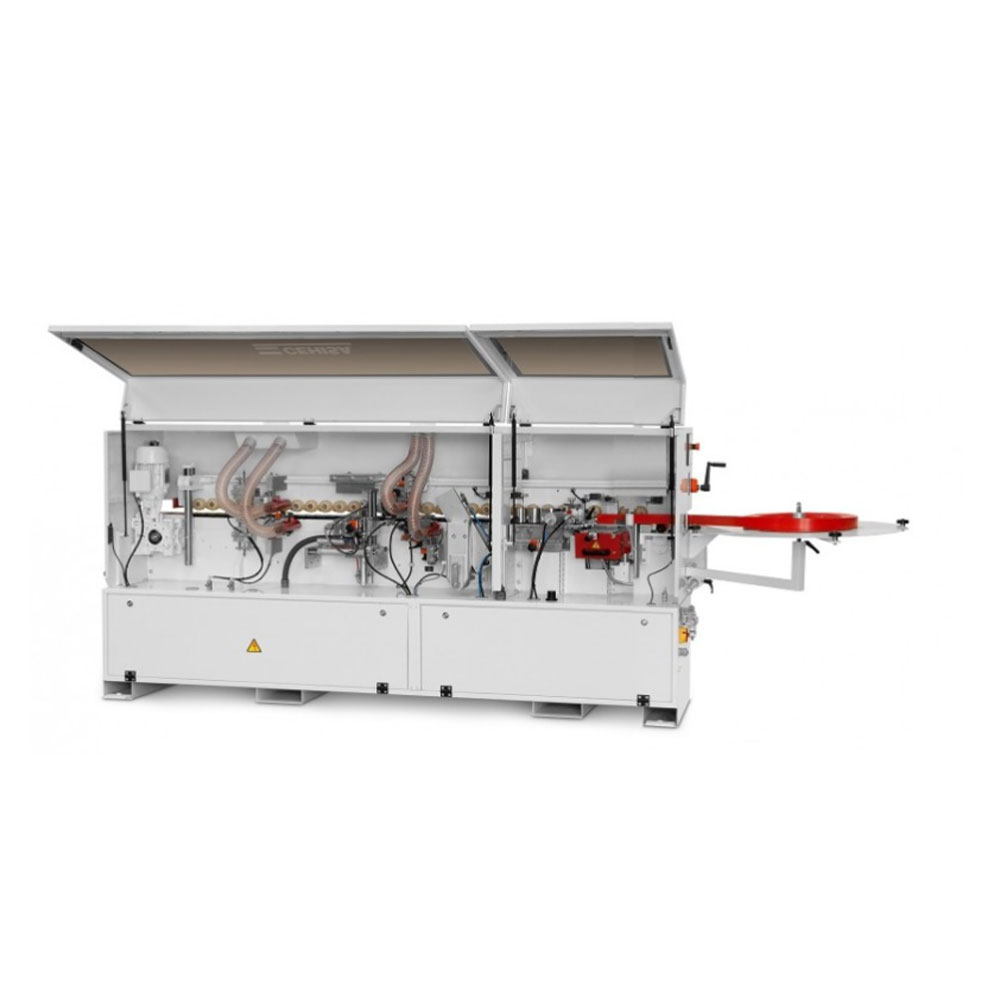 - Equipment: High frecuency motors controlled by independent electronic inverters, gluepot, end trim, top & bottom trim, corner rounding and PLC controlled by a colour LCD touch screen.