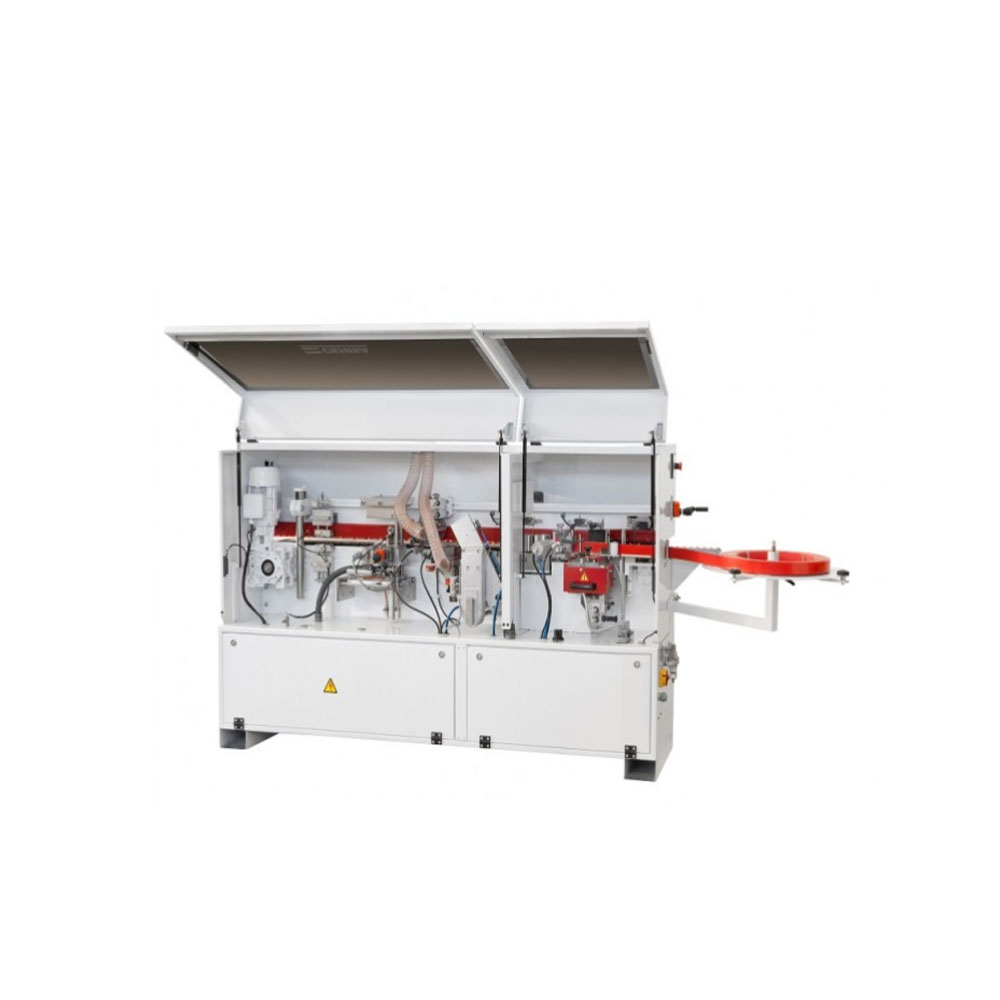 - Equipment: High frecuency motors controlled by independent electronic inverters, gluepot, end trim, top & bottom trim, corner rounding and PLC controlled by a colour LCD touch screen.
