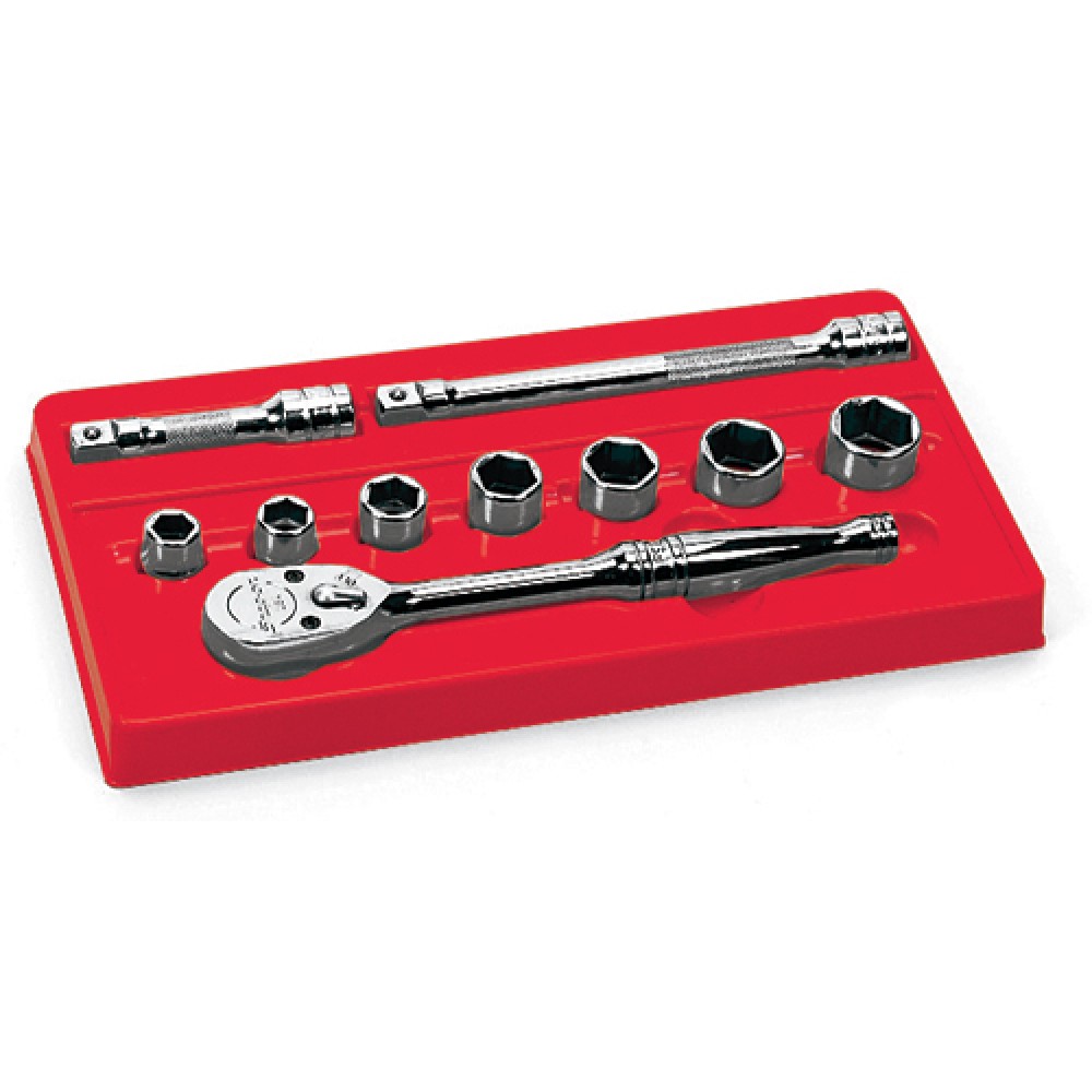 Set includes (7) 6-Point Shallow Sockets (3/8, 7/16, 1/2, 9/16, 5/8, 11/16 and 3/4"), F80 Standard Handle Sealed Ratchet and (2) Knurled Extensions (FXK3 3" and FXK6 6")